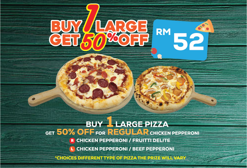 Buy 1 Large pizza get 50%  off for Regular chicken Pepperoni