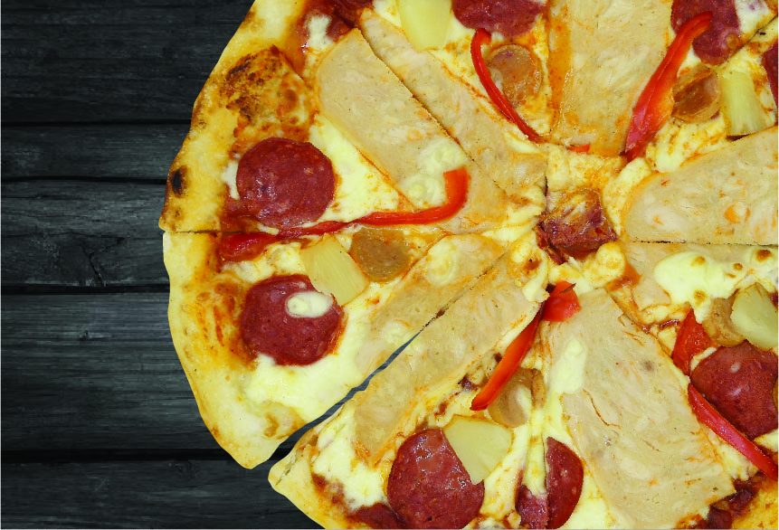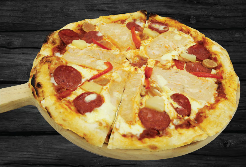 Arrabbiata Sauce, Ground Beef, Chicken Sausage, Chicken Pepperoni, Pickled Chilies, Capsicums, Onions, Mozzarella